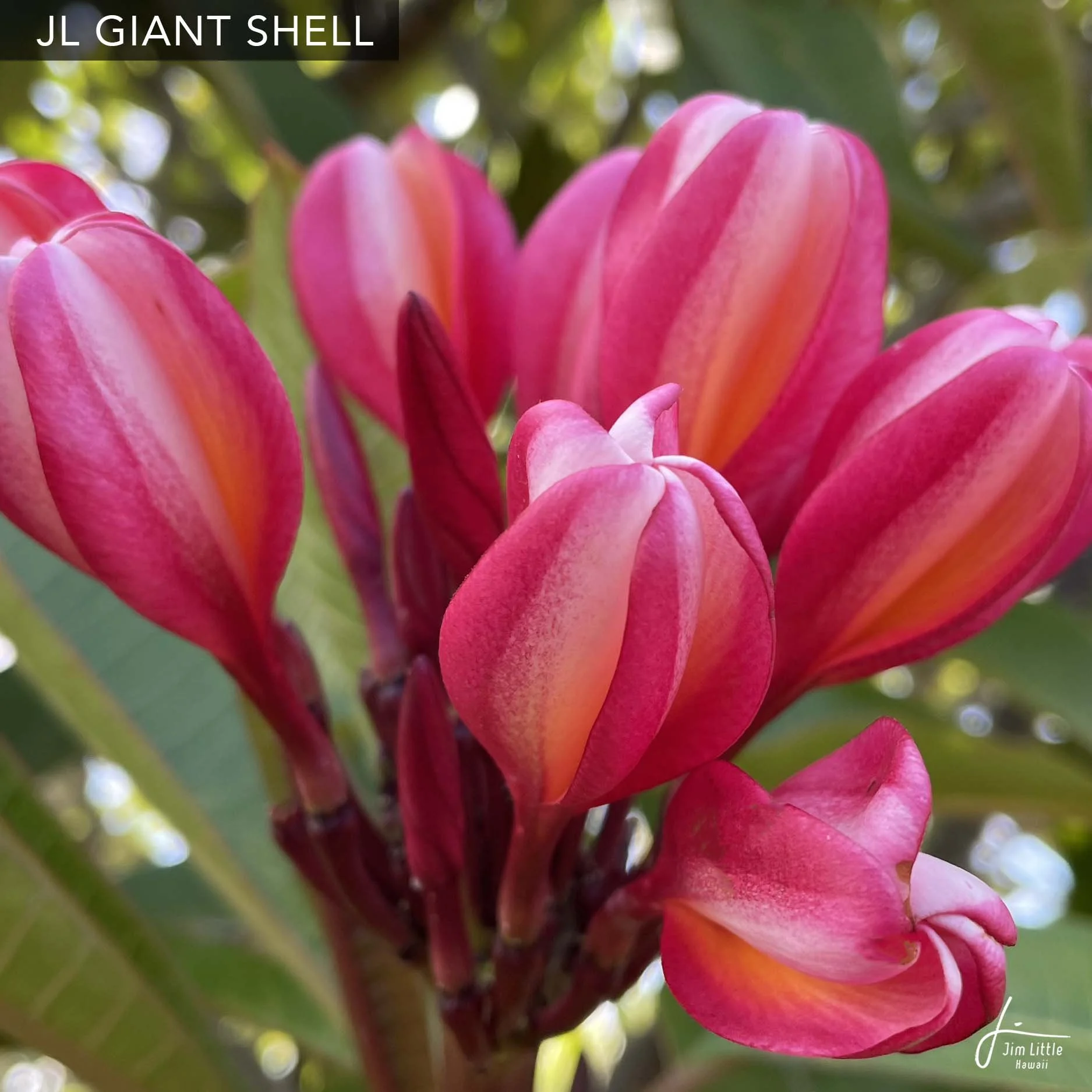 JL Madame Pele(JL マダム ペレ)---¥16,000---激しく流れる溶岩流からあらゆる創造物をうみだした、ハワイの女神ペレにちなんで名付けられました。花弁は、まるで流れる溶岩のような、鮮やかな珍しい色合いです。8cm程の花には、放射状にラインが入り一際目を引きます。レイにもむいており、キャンディのような甘い香りがします。樹形は立性です。